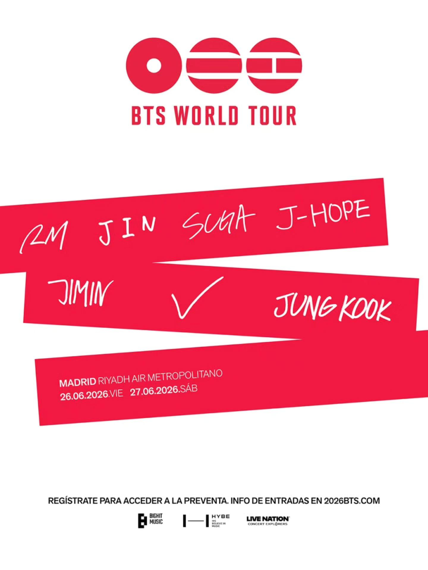 SAVE THE DATE! BTS WORLD TOUR llega oficialmente a España en 2026, con dos conciertos únicos en el Riyadh Air Metropolitano de Madrid el 26 y 27 de junio. ENTRADAS A LA VENTA: el sábado 24 de enero a las 14:00h
