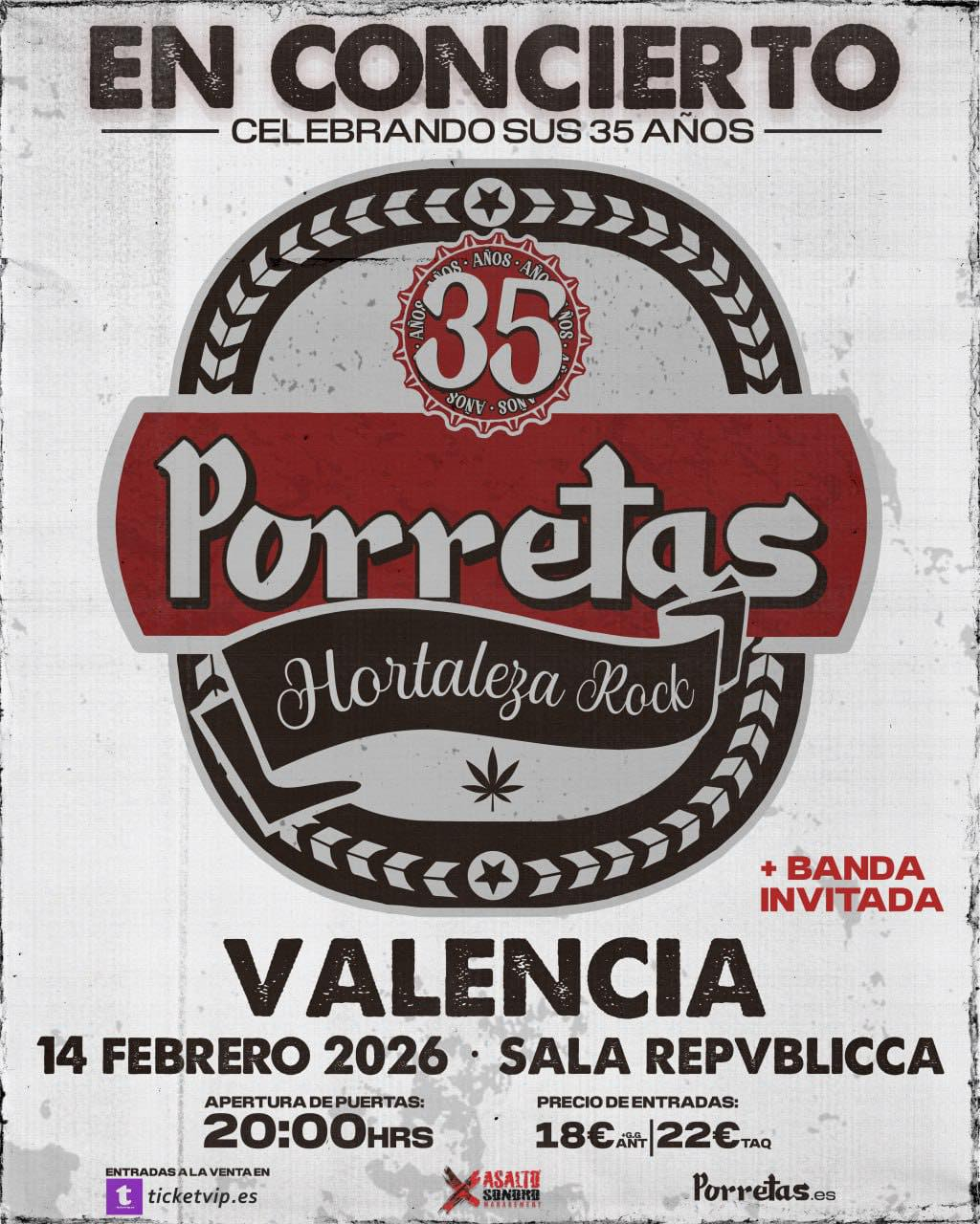 Porretas es una veterana banda de rock y rock urbano, procedente de Madrid y formada en el año 1985. Una banda con extensa historia y discográfica que sigue en activo a día de hoy actuando en las fiestas, las mejores salas y formando parte de los grandes festivales de España. Leer más.