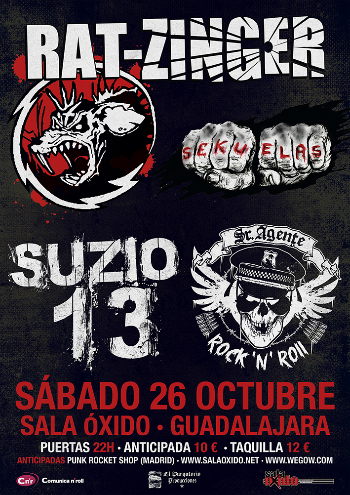 Rat-Zinger es una banda punk rock procedente de Bilbao y formada en el año 2009 por músicos experimentados. Se denominan hijos bastardos de Mötorhead o Exploited y adoradores del hardcore más chirriante. En muy poco tiempo la banda ha sacado varios LP y se ha hecho un hueco importante dentro del genero. Se caracterizan por sus letras críticas hacia la iglesia, fascismo o represión policial. Actualmente en el año 2018 van por su quinto álbum... Leer más.
