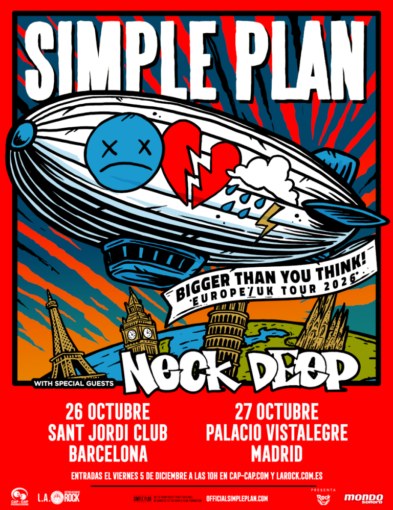 Simple Plan regresa a España en octubre de 2026 como parte de su gira “Bigger Than You Think! Europe Tour”, con dos shows muy esperados: Barcelona el 26 de octubre en el Sant Jordi Club y Madrid el 27 de octubre en el Palacio Vistalegre