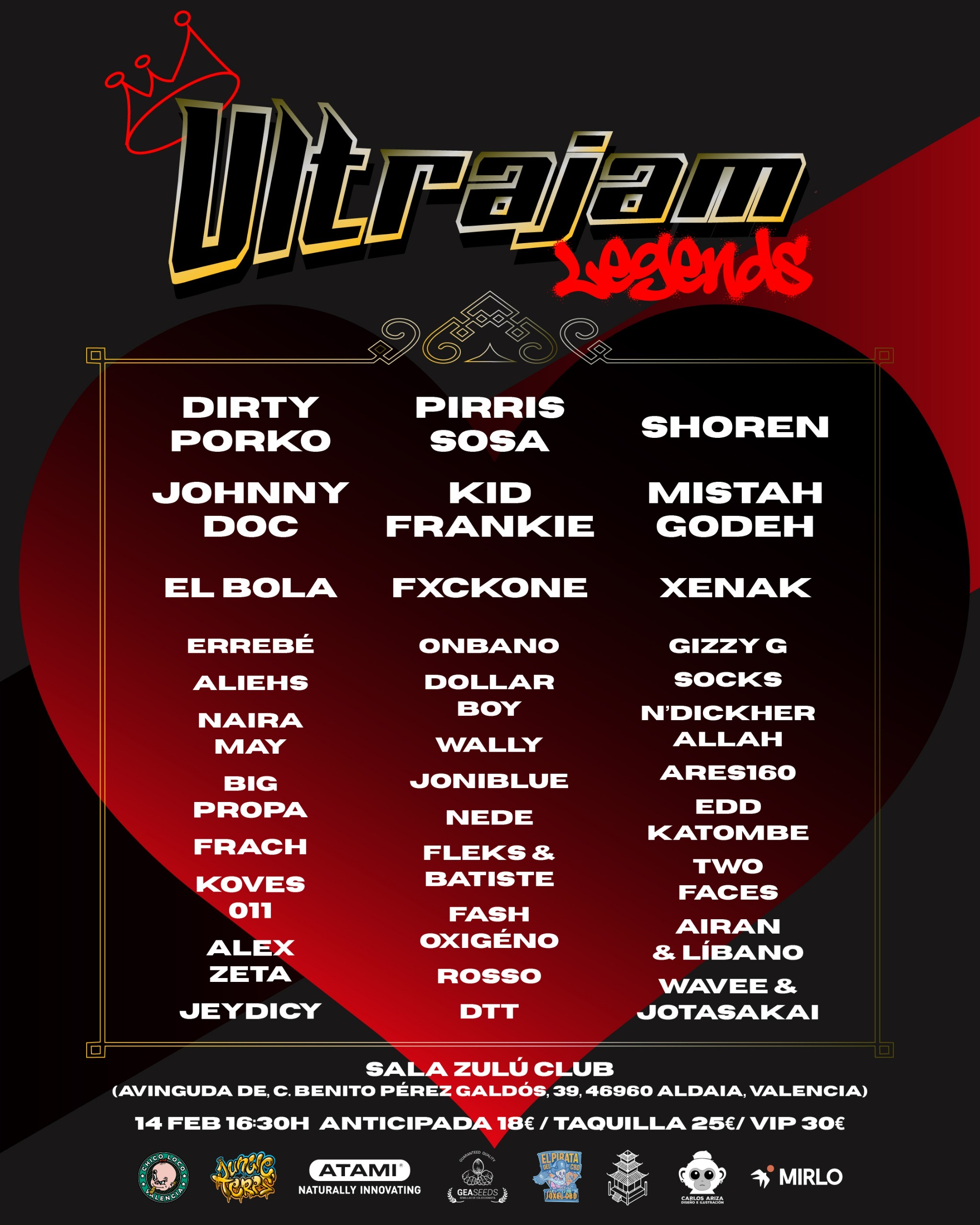ULTRAJAM LEGENDS llega a Valencia con cabezas de cartel como : Dirty Porko , Pirris Sosa , Shoren , Kid Frankie , Johnny doc , MistahGode , El Bola , Xenak y más de 20 artistas invitados, con todos los campeones de edición de la liga nacional ULTRAJAM. Shows exclusivos, colaboraciones especiales y energía non-stop. Entradas limitadas.