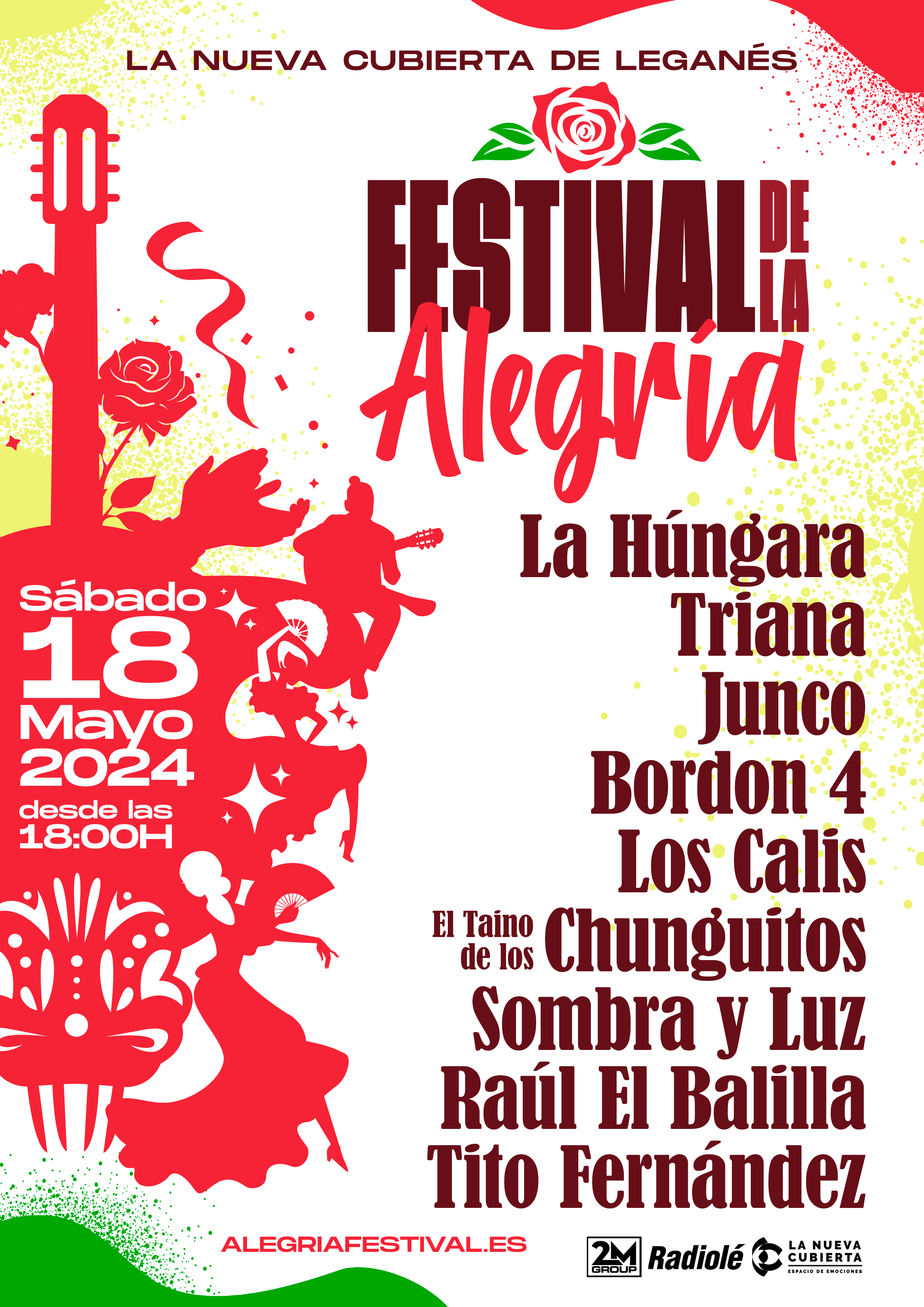 Desde leyendas de la música hasta talentos emergentes, el Festival de la Alegría ofrecerá una experiencia única para todos los amantes de la rumba y el flamenco. Disfruta durante 5 horas de la música de LA HÚNGARA, el JUNCO, TRIANA, la alegría de LOS CALIS o el canto al amor de BORDON 4, así como de grupos míticos como SOMBRA y LUZ, y nombres contemporáneos como EL BALILLA. ¡No te pierdas esta celebración única en el corazón de Madrid!