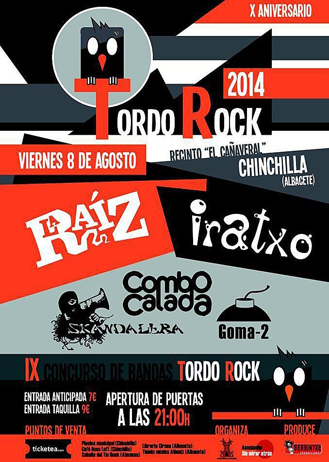 El festival TordoRock celebra este año su décimo aniversario en el municipio con y conjunto histórico Chinchilla de Montes de Aragón (Albacete). Por un precio ridículo de 7 euros tienes un impresionante cartel con grupos como Iratxo, La Raíz y Combo Calada. Les acompañaran 2 grupos locales Goma 2 y Skandalera. La gasolina para llegar seguramente te costara menos que el precio de la entrada, personalmente hablando creo que es uno de los mejores festivales calidad-precio de este año. El aforo es limitado, creo que anda sobre unos 800 personas, echa un ojo a su Facebook Oficial. Aun queda una semana pero las entradas ya están volando, hazte con la tuya lo antes posible.... Debajo te dejamos el link de Ticketea y como no el video del temazo de La Raíz "A la sombra de la sierra"... No te lo pierdas.