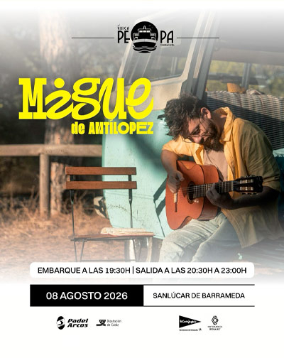 Travesía durante 2 horas y 30 minutos por la desembocadura del Río Guadalquivir al atardecer pasando por la orilla del Coto de Doñana con la actuación en directo de Migue de Antílopez, dispondremos de servicio de barra y comida