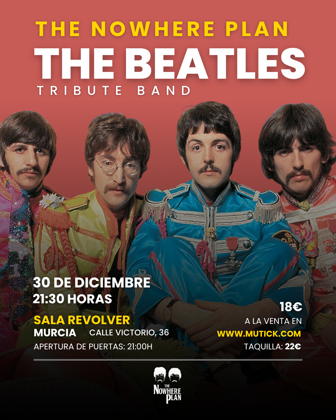 The Nowhere Plan celebra su 10º aniversario y lo hace por todo lo alto, girando por diferentes ciudades españolas. En esta ocasión, aterrizan en la Sala Revolver con una noche llena de energía, emoción y los grandes clásicos del cuarteto de Liverpool. La banda recrea con autenticidad y una calidad musical excepcional las canciones que han marcado la historia del pop, como “Come Together”, “Hey Jude”, “Something”… junto a otras joyas menos conocidas que sorprenderán incluso al público más exigente.